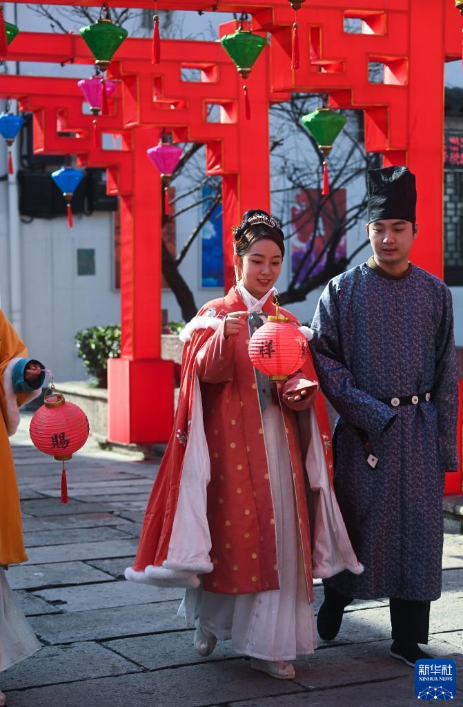 1月11日,人們?cè)诤贾菔杏嗪紖^(qū)瓶窯鎮(zhèn)瓶窯老街年貨節(jié)上身著傳統(tǒng)服飾體驗(yàn)傳統(tǒng)民俗。