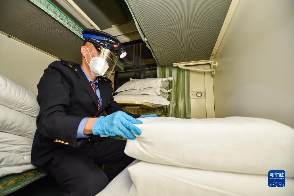 1月10日,在呼和浩特客運段整備旅服車間,列車員為列車換上干凈臥具。