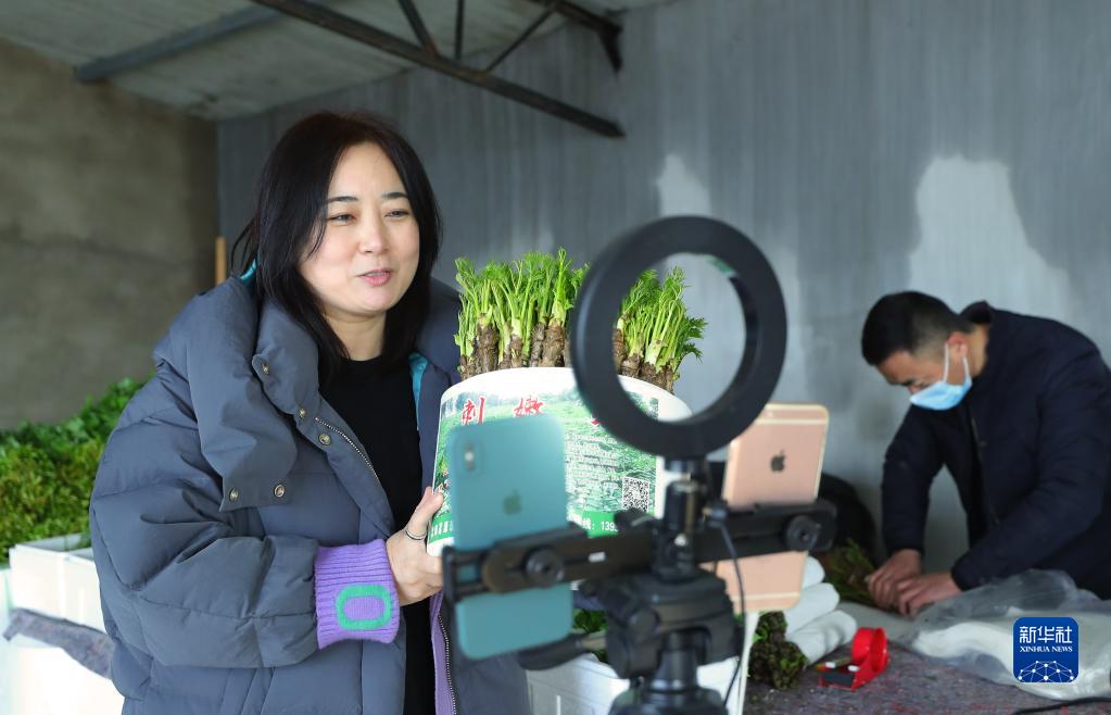 1月9日,在新民市大民屯鎮(zhèn)毓寶臺(tái)村大棚里,農(nóng)民在大棚里直播銷售刺嫩芽盆栽。