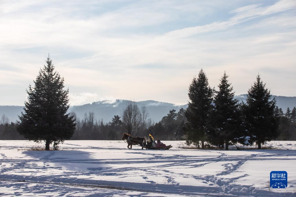 1月10日,在黑龍江省漠河市北極村,游客乘坐馬拉爬犁。