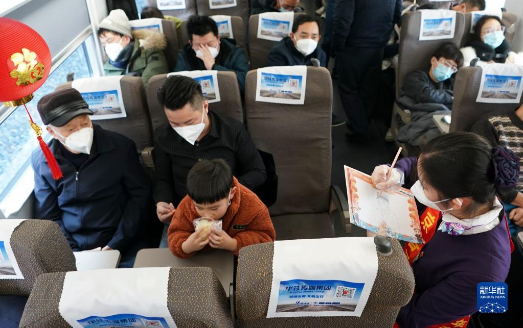 當日,中國鐵路上海局集團有限公司南京客運段高鐵二車隊在D376次列車上開展“回家路上的笑容”繪畫活動,列車員現場為旅客作畫,送上新年祝福。