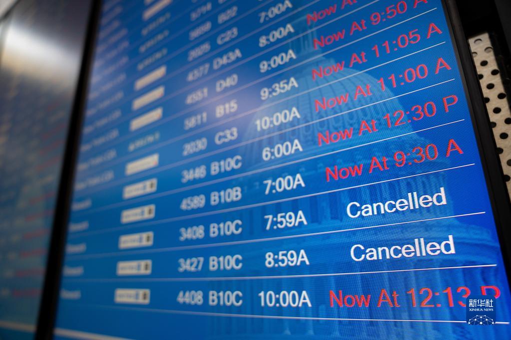 1月11日,在美國(guó)弗吉尼亞州阿靈頓的里根國(guó)家機(jī)場(chǎng),信息顯示眾多航班延誤或取消。新華社記者 劉杰 攝