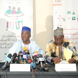 1月11日,貝寧全國(guó)選舉自治委員會(huì)主席薩卡·拉菲亞(中)在科托努公布國(guó)民議會(huì)選舉初步結(jié)果。
