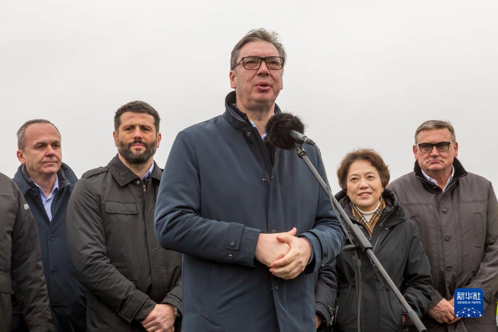1月11日,塞爾維亞總統(tǒng)武契奇(中)在首都貝爾格萊德視察“新貝爾格萊德-蘇爾欽”高速公路項目施工現(xiàn)場時講話。