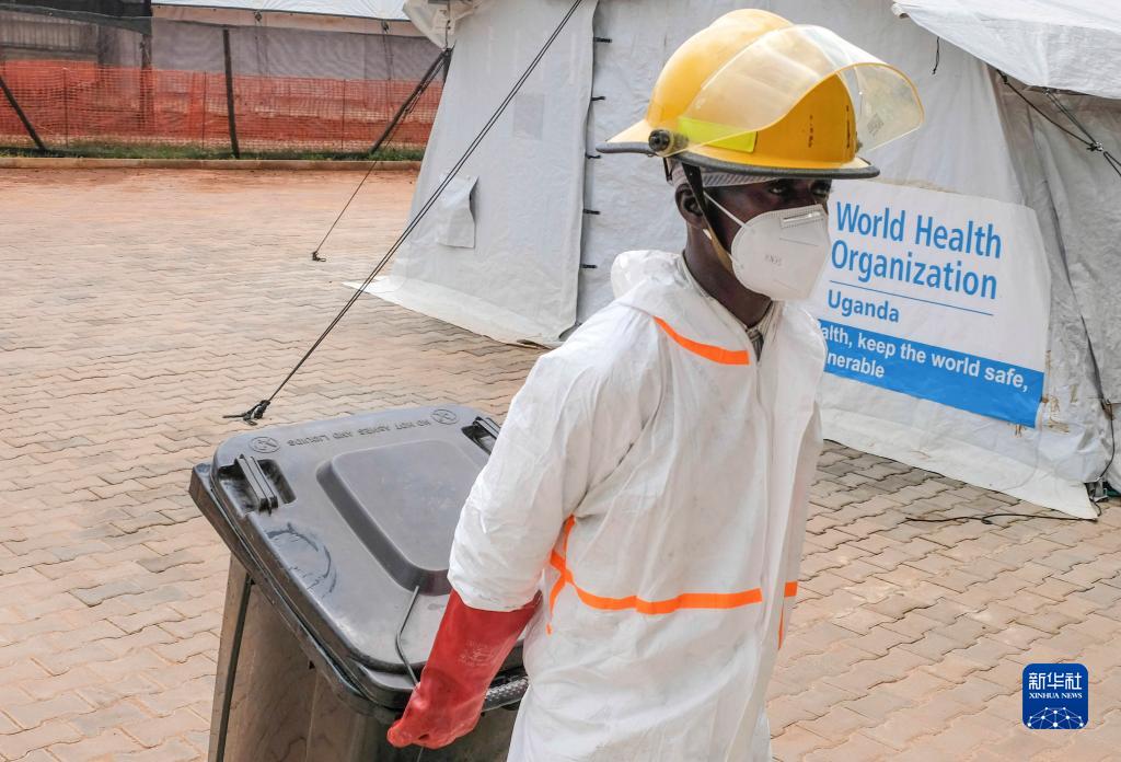 1月11日,在烏干達(dá)中部地區(qū)穆本德,一名清潔工人拖著垃圾箱走在埃博拉治療中心內(nèi)。
