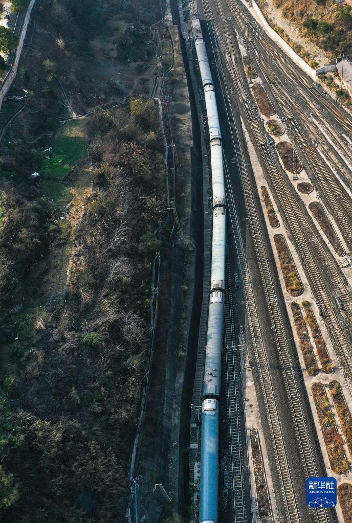 1月11日, 5640次列車從貴州凱里市附近駛過(無人機照片)。