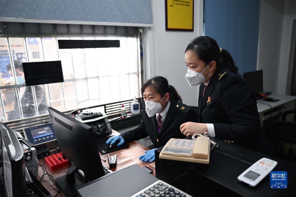 在??诘幕浐hF路輪渡南港碼頭售票處,伍琳(右)和同事討論業(yè)務(wù)(1月9日攝)。