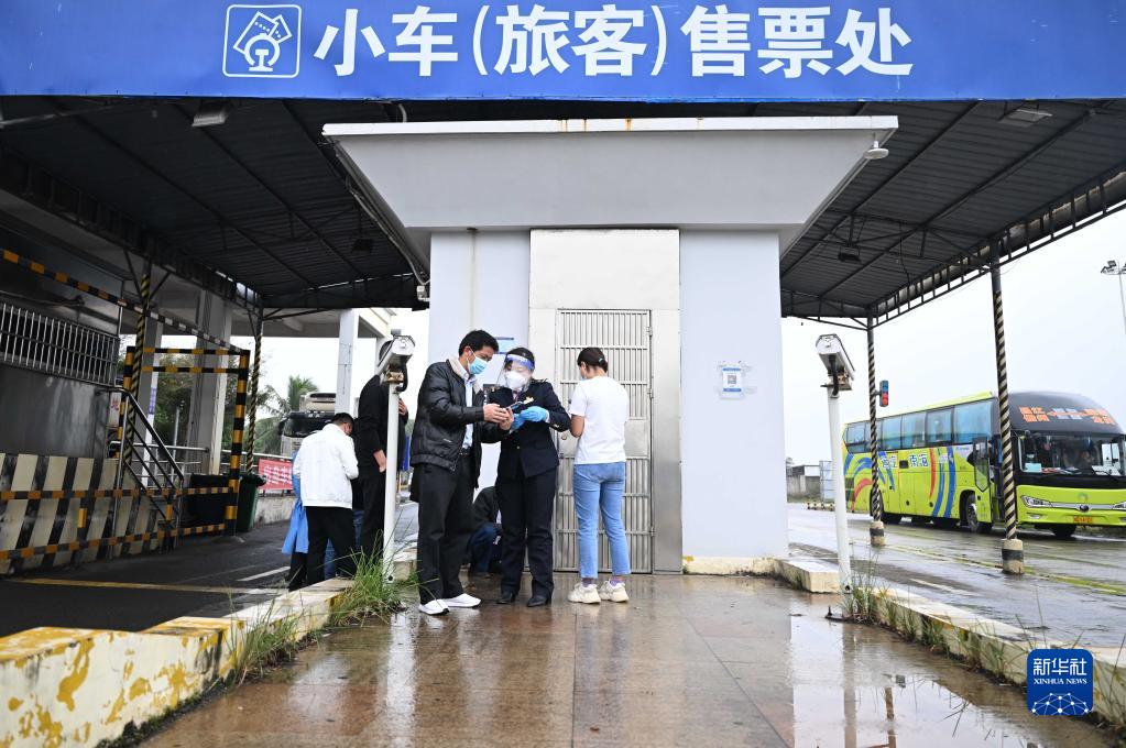 在海口的粵海鐵路輪渡南港碼頭售票處,伍琳(右二)幫助旅客在小程序上購買船票(1月9日攝)。