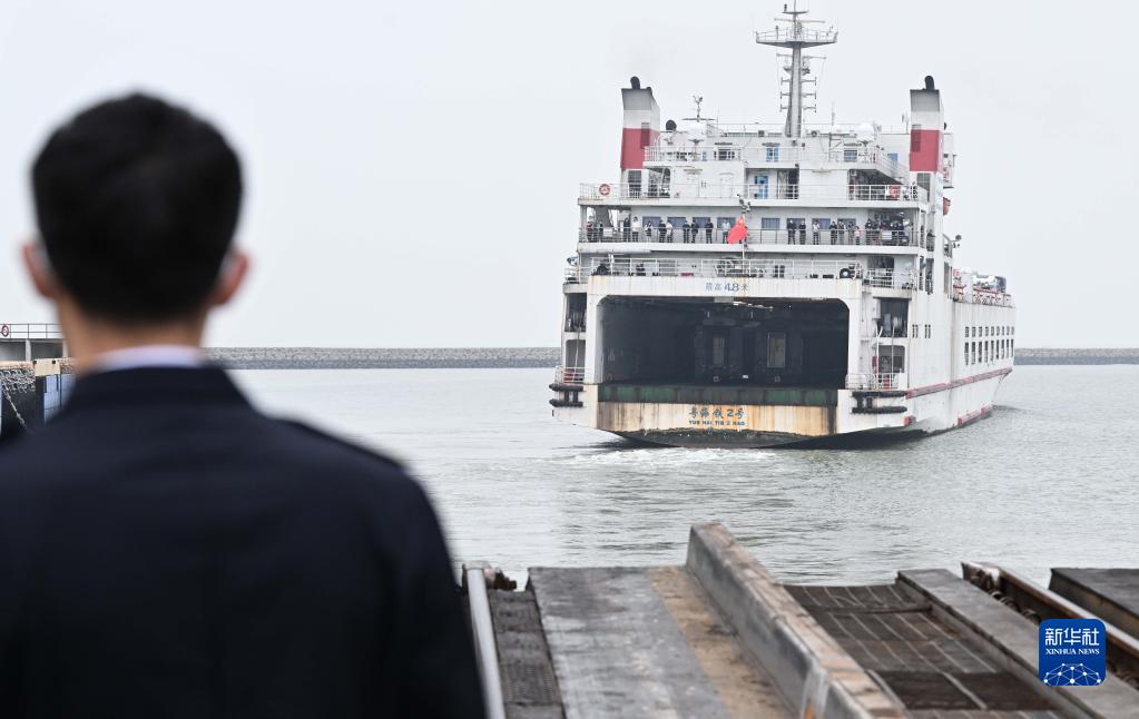 在廣東徐聞的粵海鐵路輪渡北港碼頭的火車棧橋上,熊美周目送離港的輪渡(1月8日攝)。