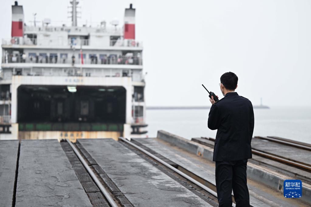 在廣東徐聞的粵海鐵路輪渡北港碼頭的火車棧橋上,熊美周用對講機和同事通話(1月8日攝)。