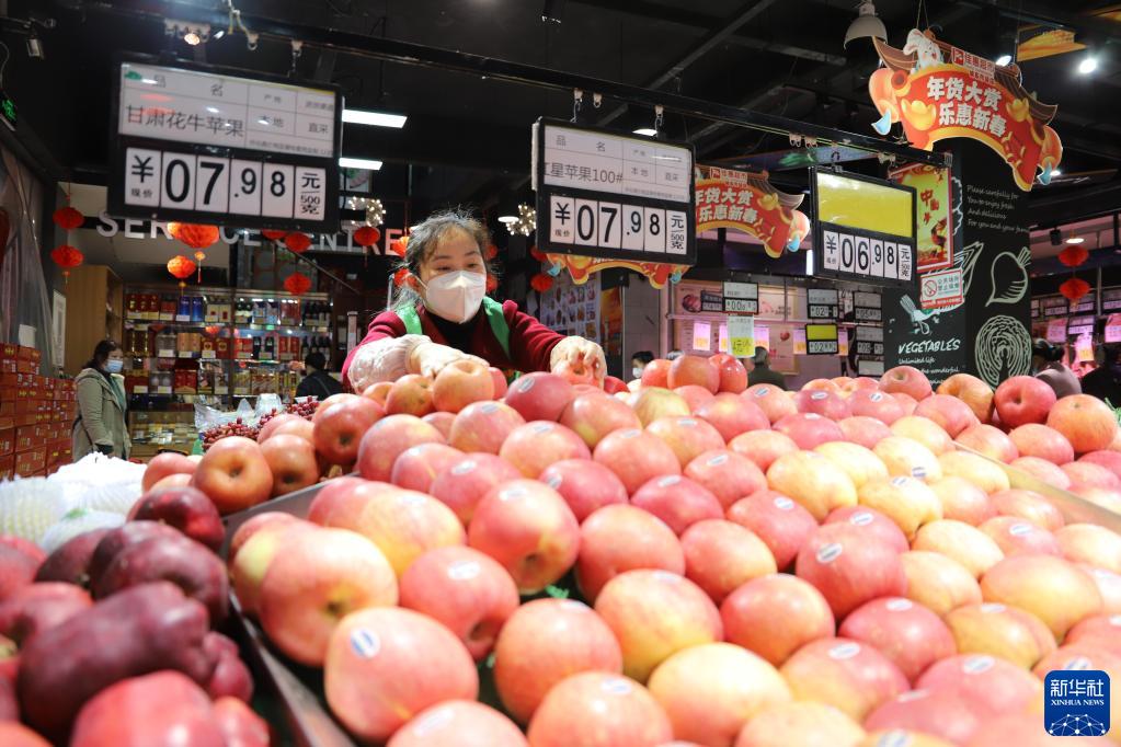 1月12日,湖南省懷化市通道侗族自治縣一家超市的工作人員在碼放水果。