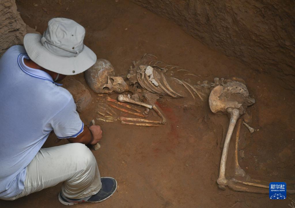 考古人員在石峁遺址皇城臺發現的高等級墓地中進行發掘(2022年8月6日攝)。