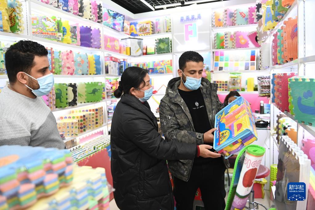 1月11日,外國客商(右)在義烏國際商貿城選購玩具。