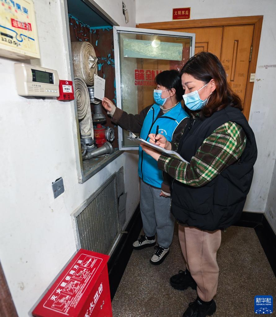 1月12日,在飛英街道河畔居小區內,社區安全生產負責人聯合網格員開展節前消防安全檢查。