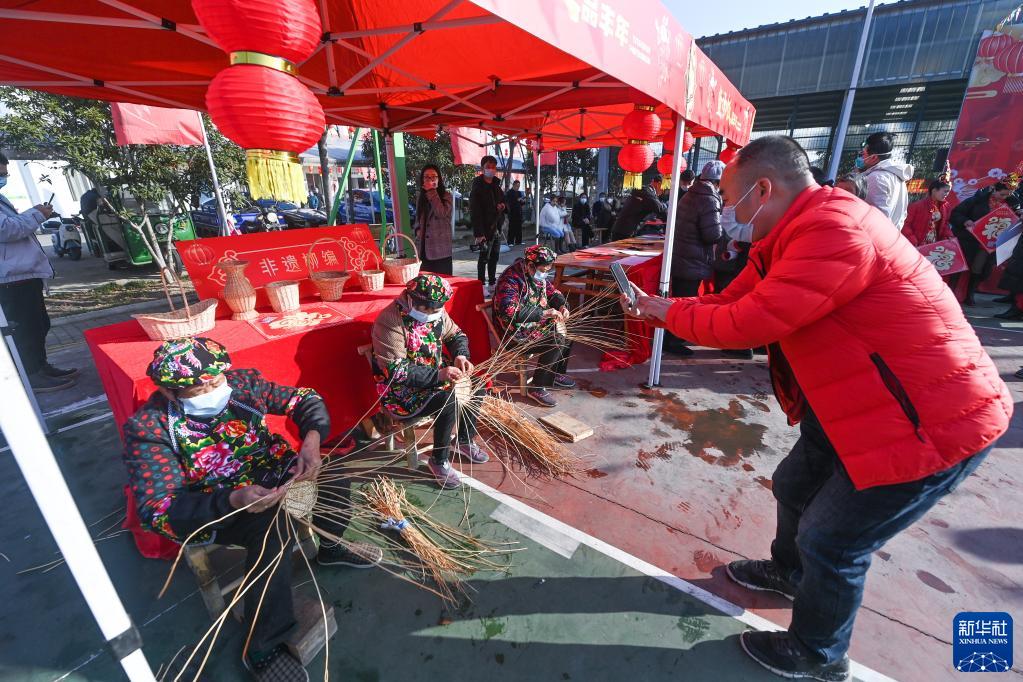 1月12日,村民在活動現場展示傳統柳編。