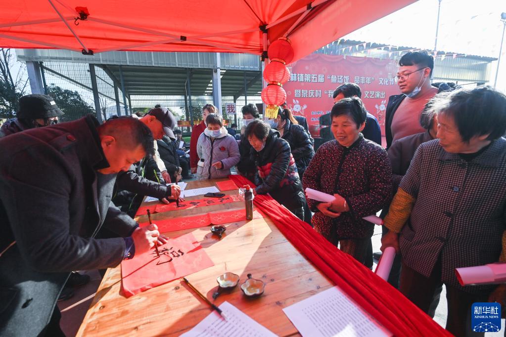 當(dāng)日,浙江省湖州市吳興區(qū)東林鎮(zhèn)的水鄉(xiāng)“魚湯飯 品豐年”迎春活動(dòng)在泉慶村舉辦,活動(dòng)包括清塘捕魚,魚湯飯、魚圓魚餅、刺毛圓子、手作年糕等年味美食的制作及品嘗,還有歌舞表演、非遺柳編現(xiàn)場(chǎng)展示、書法愛好者寫春聯(lián)送祝福等。