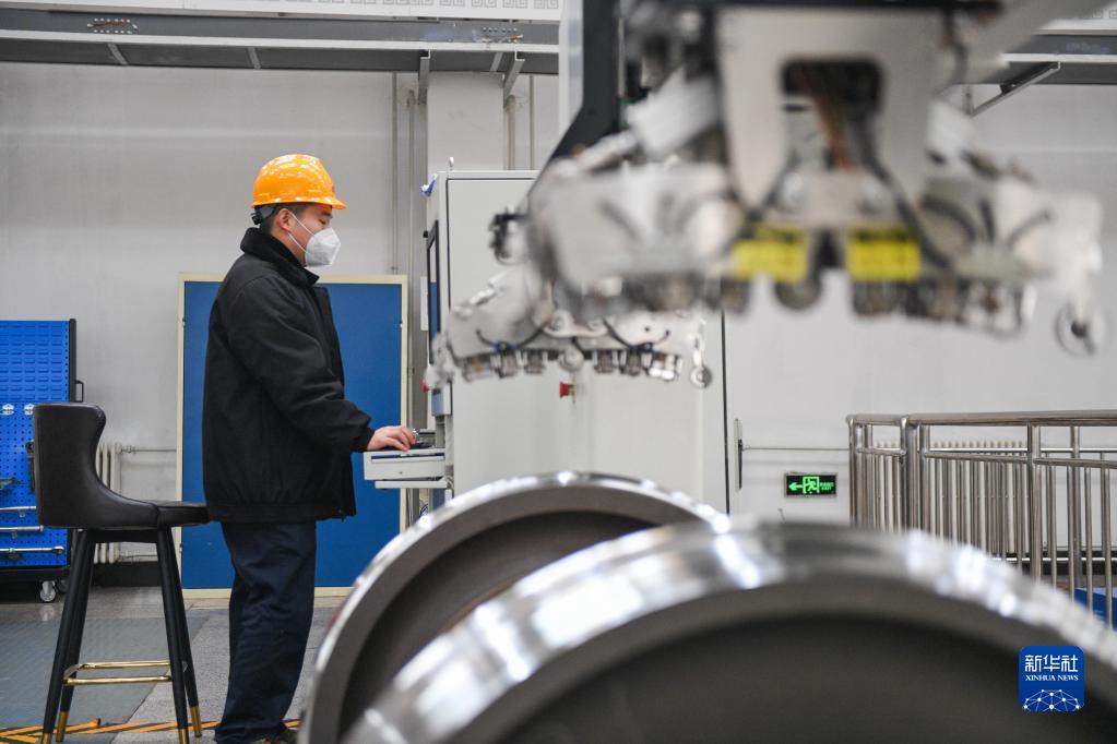 1月12日,在包頭車輛段檢修車間輪軸檢修間,工作人員操作設(shè)備對輪軸進(jìn)行超聲波探傷。