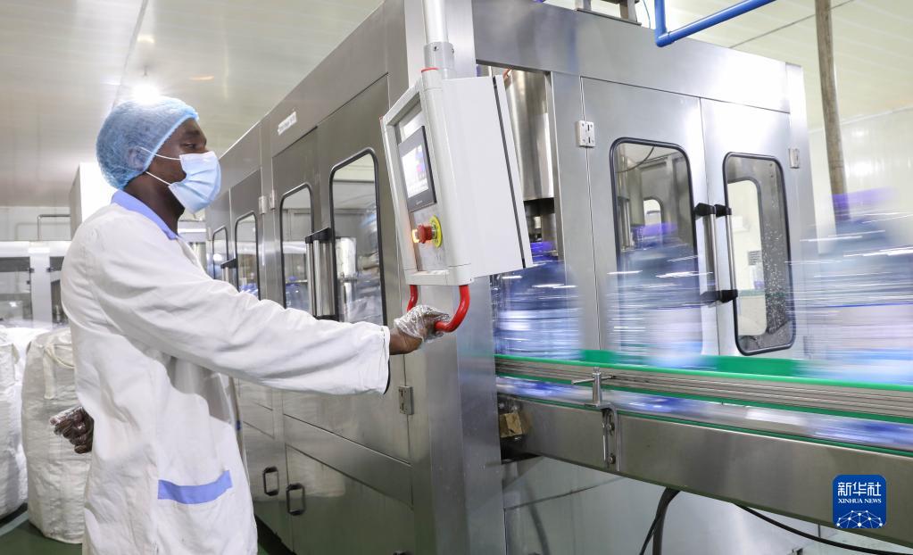 2023年1月2日,在加蓬首都利伯維爾的恩考克經濟特區,當地工人在一家中國純凈水公司工作。
