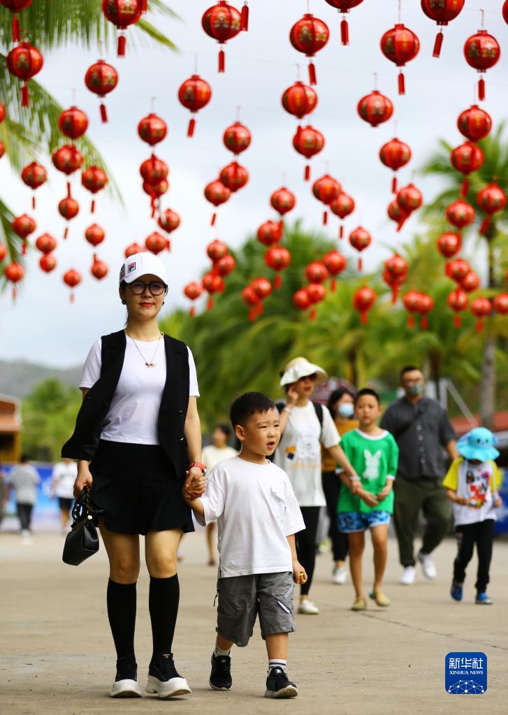 1月12日,家長帶著孩子在海南省三亞南山文化旅游區(qū)游覽。