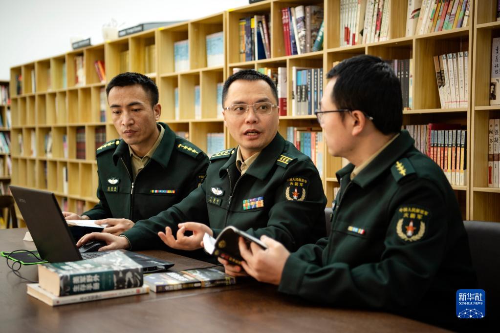 火箭軍某部處長(zhǎng)丁國(guó)林(中)與骨干一起研究對(duì)抗訓(xùn)練問(wèn)題(資料照片)。