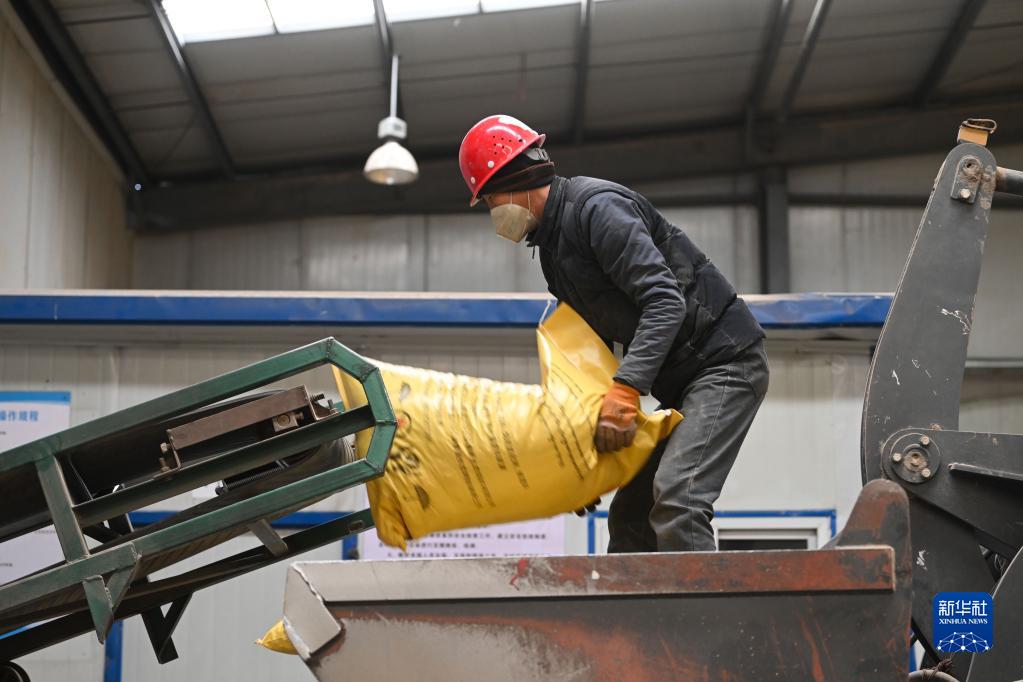 1月12日,青海省剛察縣一家飼料生產企業,工作人員在搬運成品飼料。