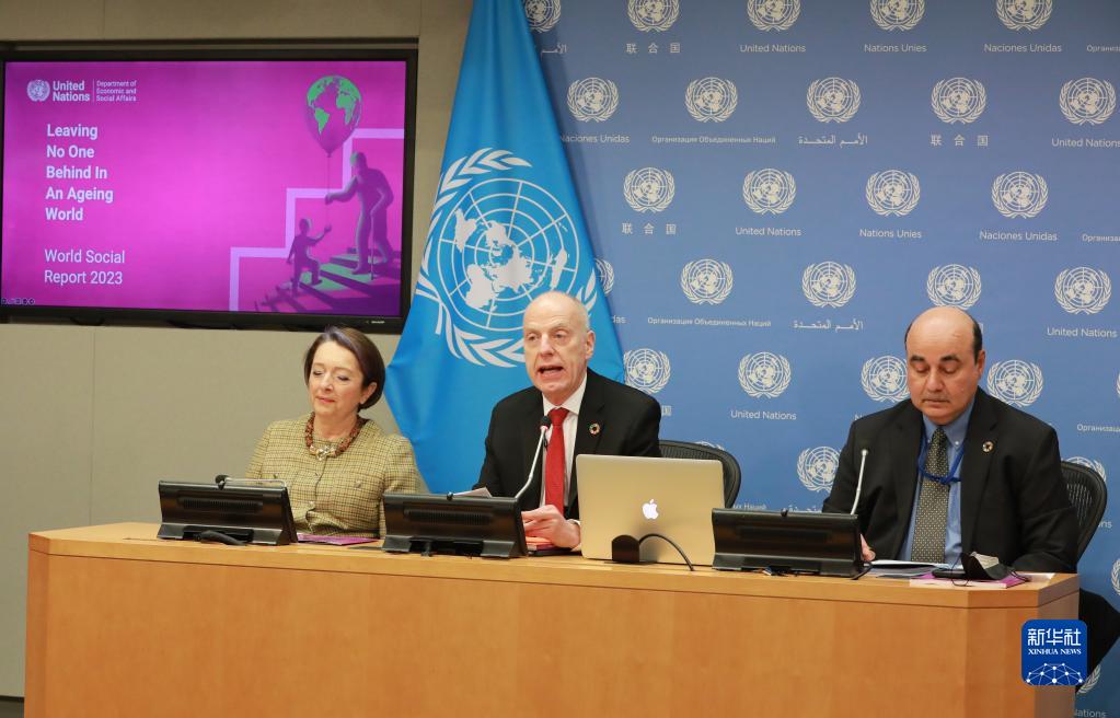 1月12日,在紐約聯(lián)合國總部,聯(lián)合國經(jīng)濟(jì)和社會事務(wù)部人口司司長約翰·威爾莫斯(中)在《2023年世界社會報告》發(fā)布會上講話。