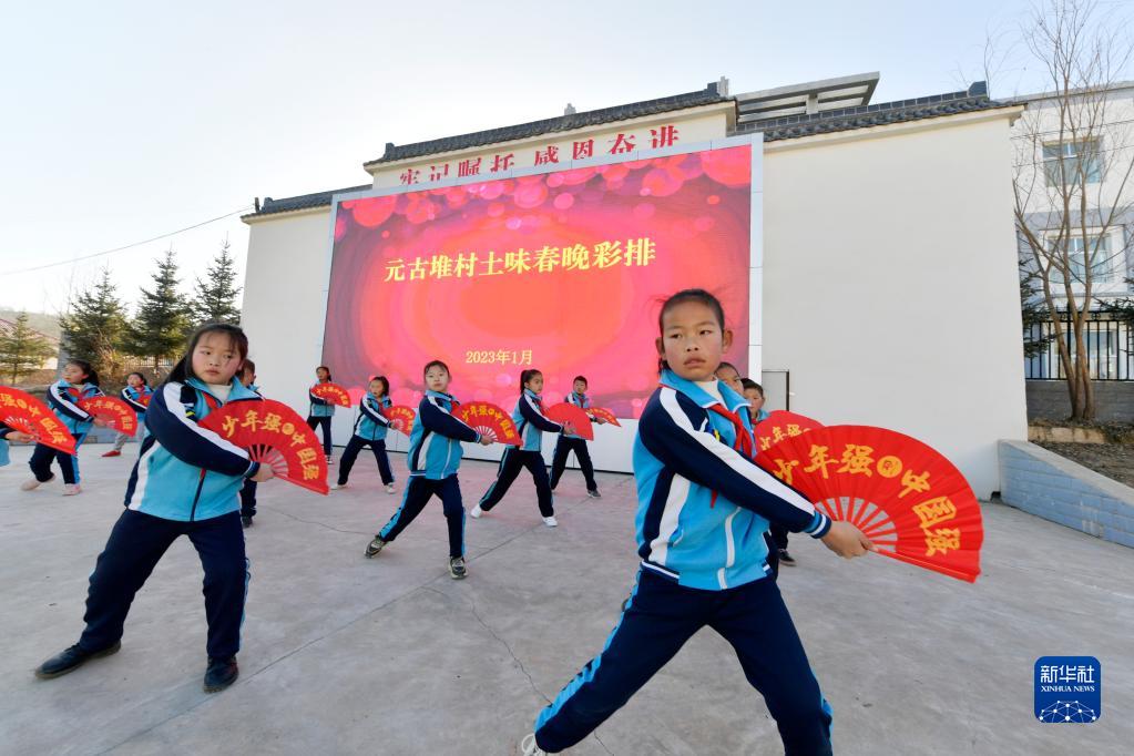 1月10日,在元古堆村村民廣場(chǎng),學(xué)生們?cè)谂啪毚和淼墓?jié)目。