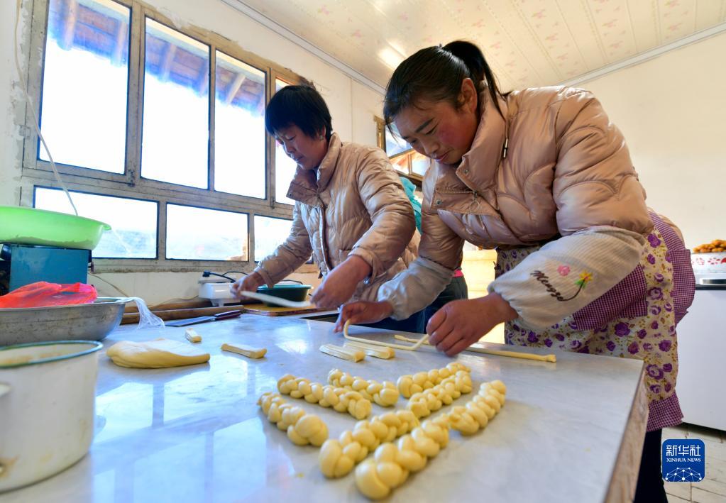 1月12日,元古堆村的村民在制作麻花。