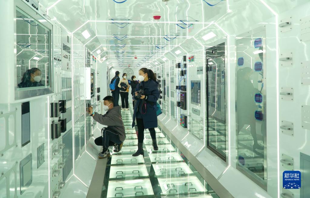 1月13日,在山東省科技館新館,參觀者在一處模擬空間站的展區內參觀。