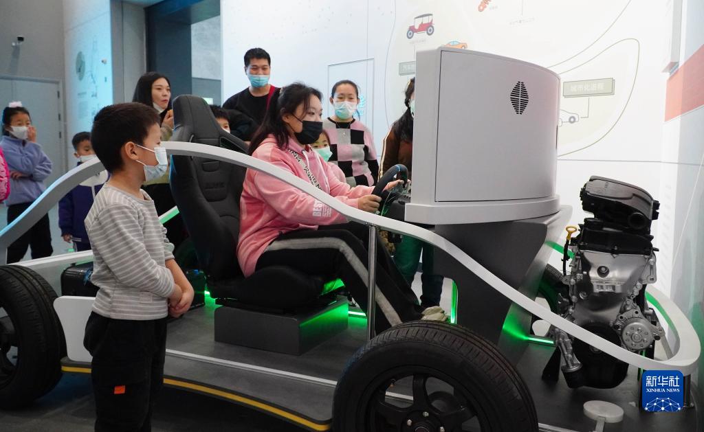 1月13日,在山東省科技館新館,參觀者在體驗模擬汽車駕駛的展品。