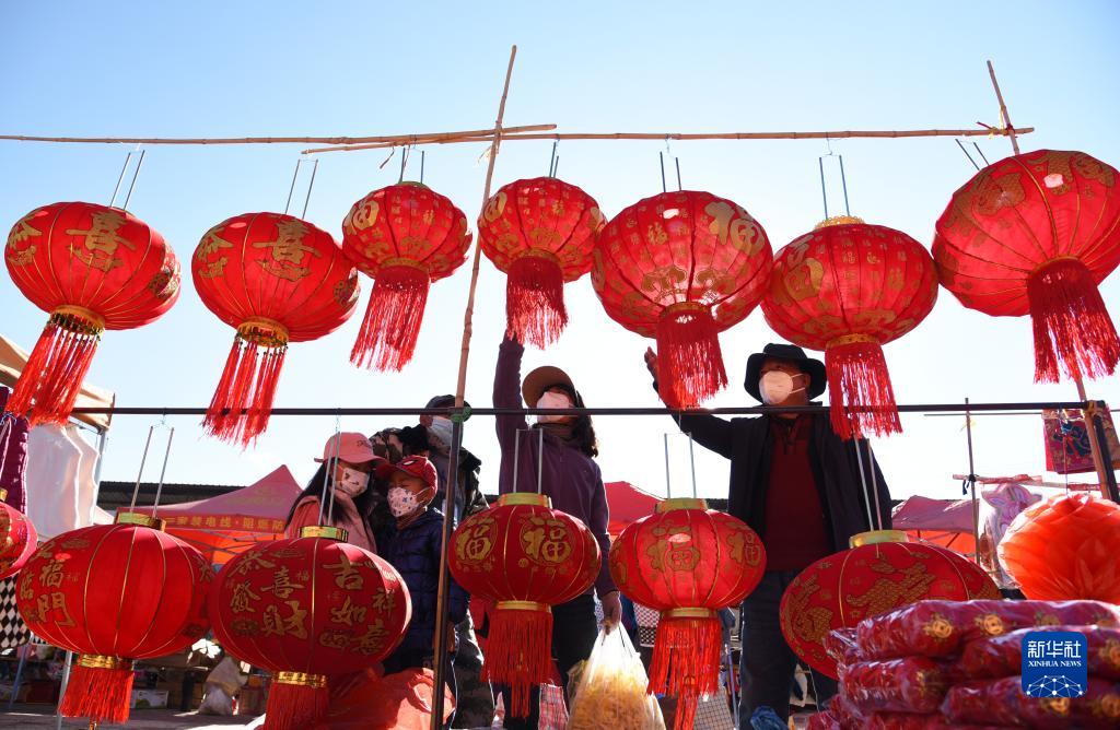 1月13日,在云南省麗江市玉龍納西族自治縣太安鄉,村民在集市上采購燈籠。