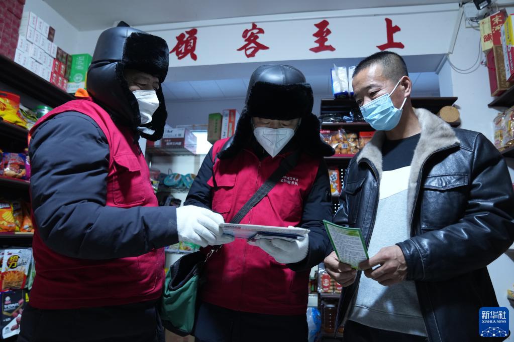 1月11日,國網撫遠市供電分公司抓吉供電所所長白樺先(左)和工友費義偉(中)為商戶講解春節前用電注意事項。