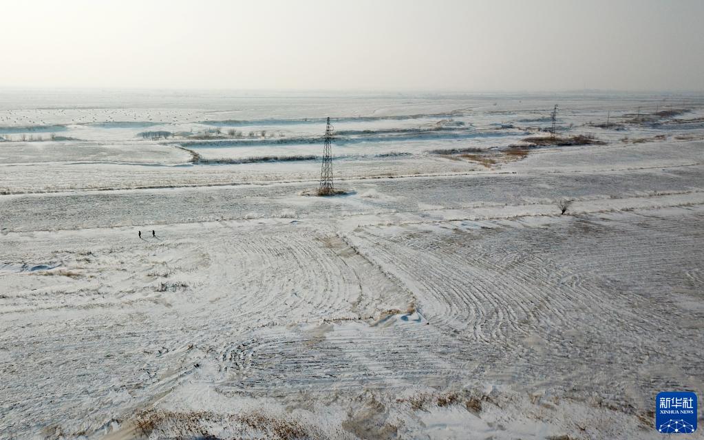 1月12日,國網撫遠市供電分公司抓吉供電所所長白樺先和工友費義偉在巡視東極線的路上(無人機照片)。