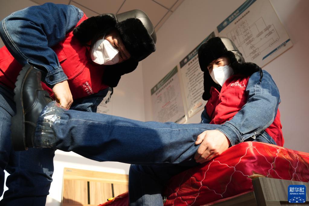 1月12日,國網撫遠市供電分公司抓吉供電所所長白樺先(左)在幫著工友費義偉用膠帶纏住褲腿,避免巡線時鞋里進雪。