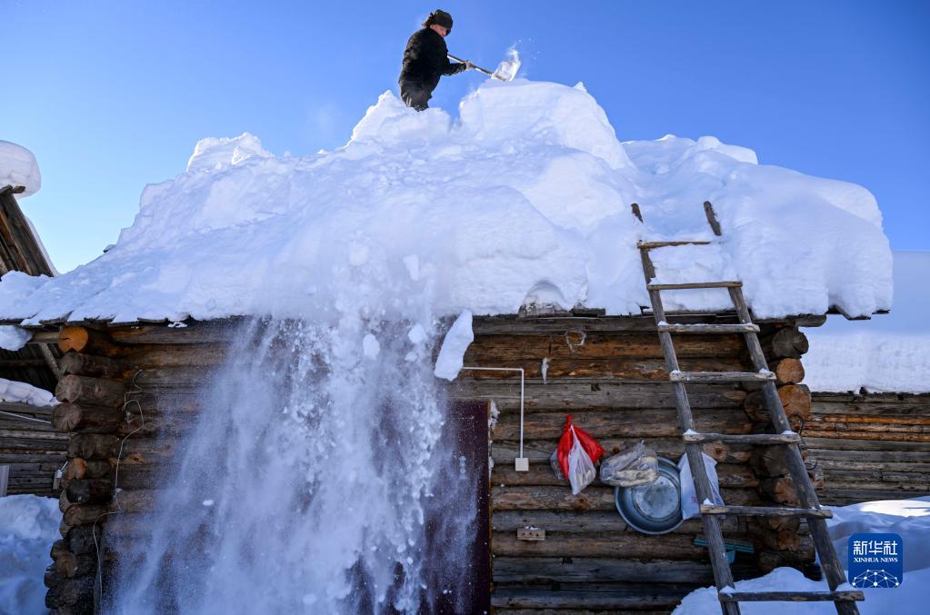 新疆阿勒泰地區(qū)禾木村村民木拉提·哈森張在清理小木屋頂積雪(1月12日攝)。他已將自家的10間房屋租給景區(qū)商戶開辦民宿。