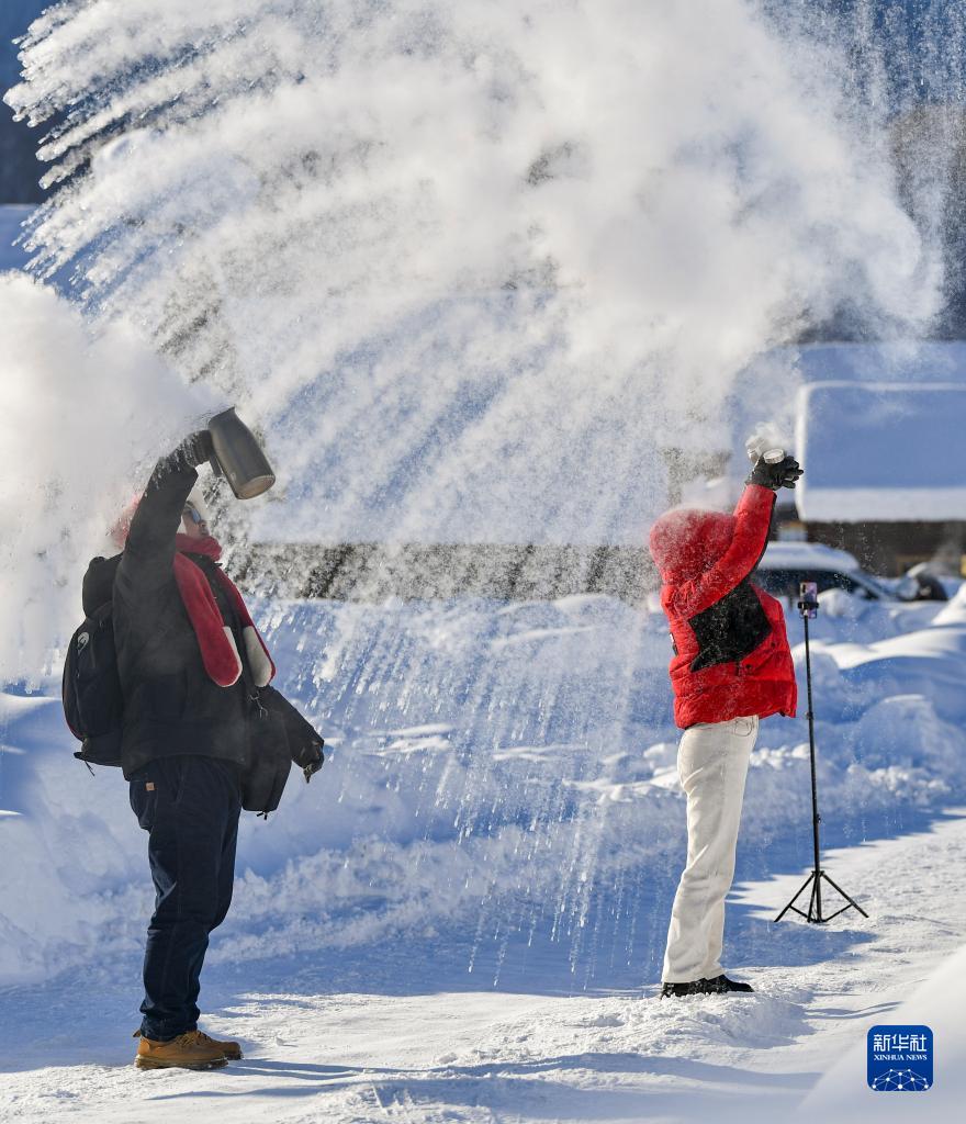 在新疆阿勒泰地區(qū),當(dāng)日最低氣溫降至零下37攝氏度,游客體驗(yàn)“潑水成冰”并進(jìn)行網(wǎng)絡(luò)直播(1月12日攝)。
