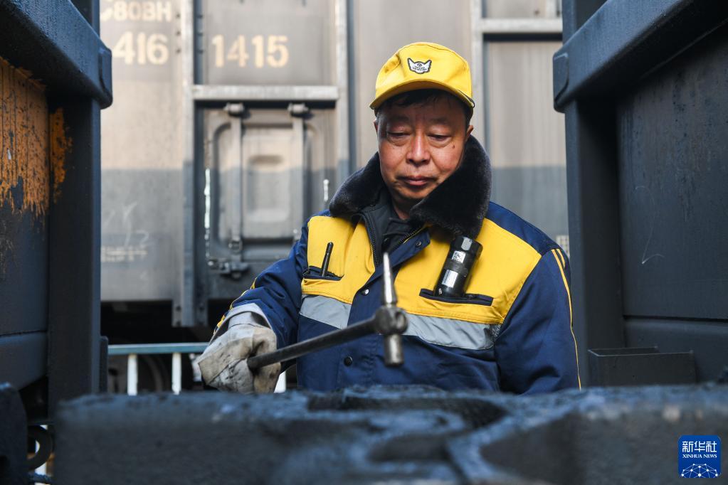 1月12日,吉海清在用檢點錘為萬噸大列進行敲擊檢查。新華社記者 劉磊 攝