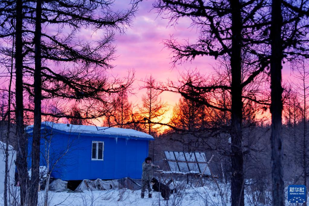 1月12日清晨,覺樂在馴鹿點的“房車”前呼喚自己養的兩條狗,準備出去尋找鹿群。新華社記者 費茂華 攝