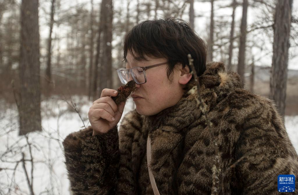 1月12日,覺樂從一棵松樹上取下一塊樹皮,使勁兒嗅著。這種松香味讓他回憶起小時(shí)候看部落里的老人們制作樺樹皮筏子的情景。老人們把松樹的松香熬成一種粘性很強(qiáng)的膠水,抹在皮筏子上防止漏水。新華社記者 費(fèi)茂華 攝