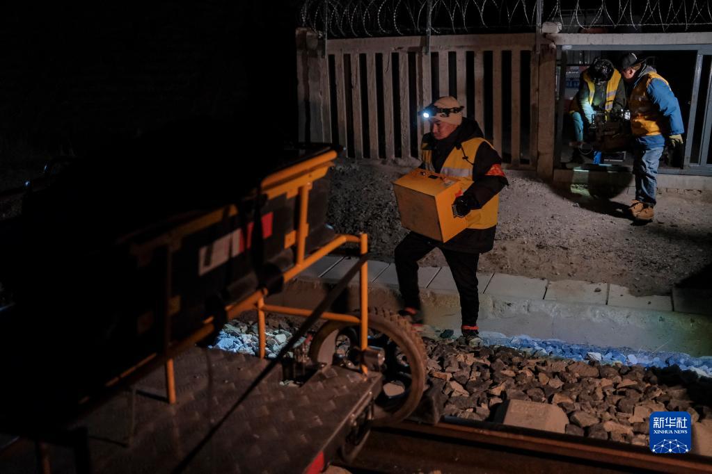 羅布和同事進行鋼軌探傷前的準備工作(1月12日攝)。