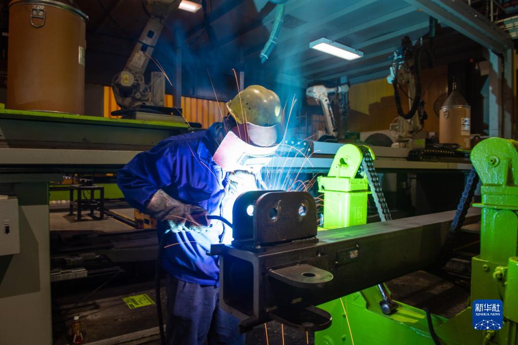 1月13日,在位于常德高新區的中聯重科建筑起重機械有限責任公司生產車間,工作人員對產品零部件進行焊接生產作業。