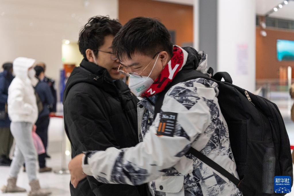 1月12日,在綏芬河公路口岸旅檢大廳,入境旅客與許久不見的親友擁抱。