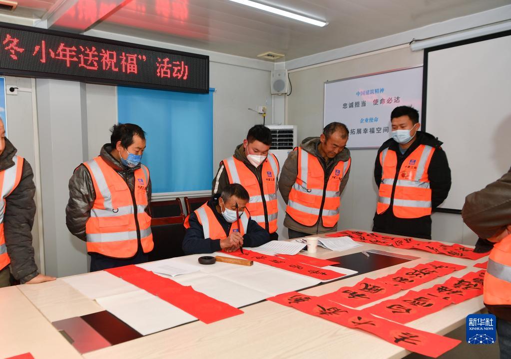1月13日,在位于陜西省西安市的絲路會展安置小區(qū)建設(shè)項目現(xiàn)場,來自中建三局西北公司的書法愛好者為工人書寫春聯(lián)。