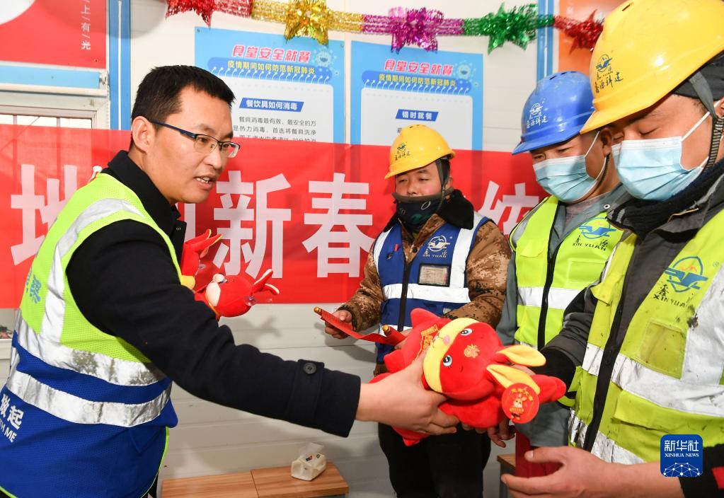 1月13日,在位于陜西省西安市的陜西師范大學(xué)體育訓(xùn)練中心建設(shè)項(xiàng)目現(xiàn)場(chǎng),中建三局西北公司項(xiàng)目管理人員(左)向工人發(fā)放兔年紀(jì)念品。