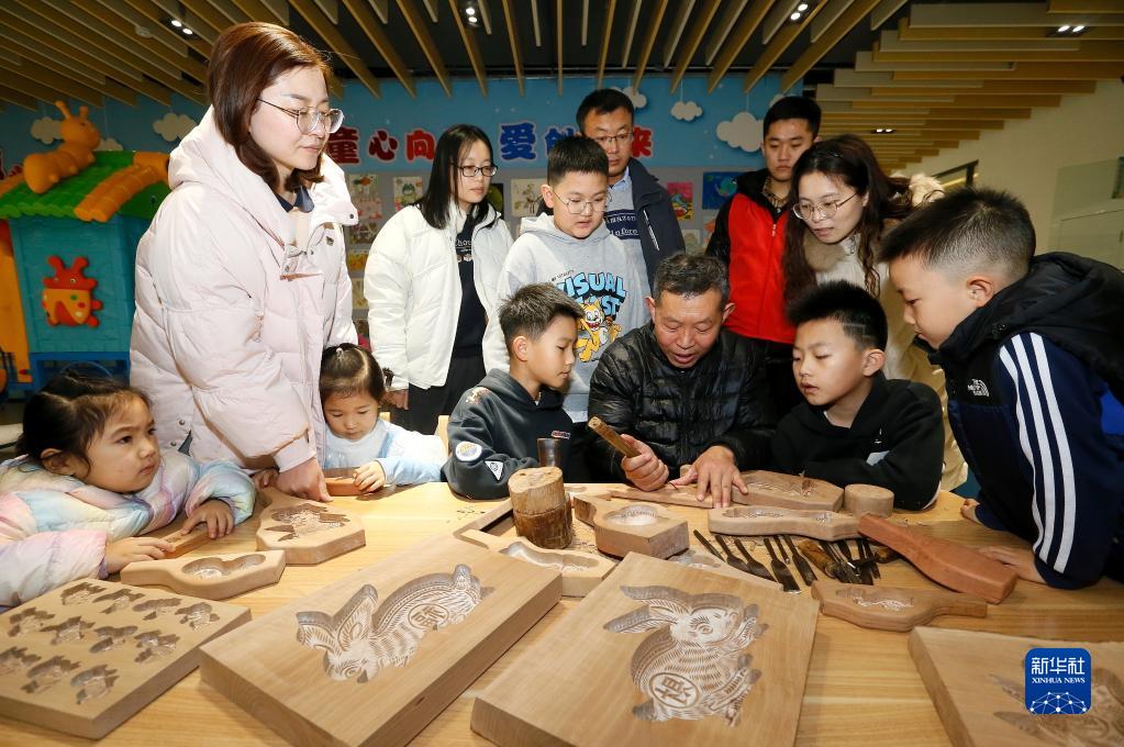 當日,“手藝迎新春 年味有傳承”主題創作體驗活動在山東省青島市即墨區新時代文明實踐中心舉行,來自當地的剪紙、柳編、烙畫等傳統技藝手藝人與孩子們共同了解春節習俗,學習手工技藝,喜迎新春到來。新華社發(梁孝鵬 攝)