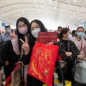 當日,G1008次愛心專列搭載著500多名長期在深圳工作的文明實踐志愿者從深圳北站駛往武漢。G1008次列車是深圳鐵路部門今年春運開出的第6趟愛心專列,暖心助力深圳地區的文明實踐志愿者和城市奮斗者及家人順利回家過年。新華社記者 毛思倩 攝