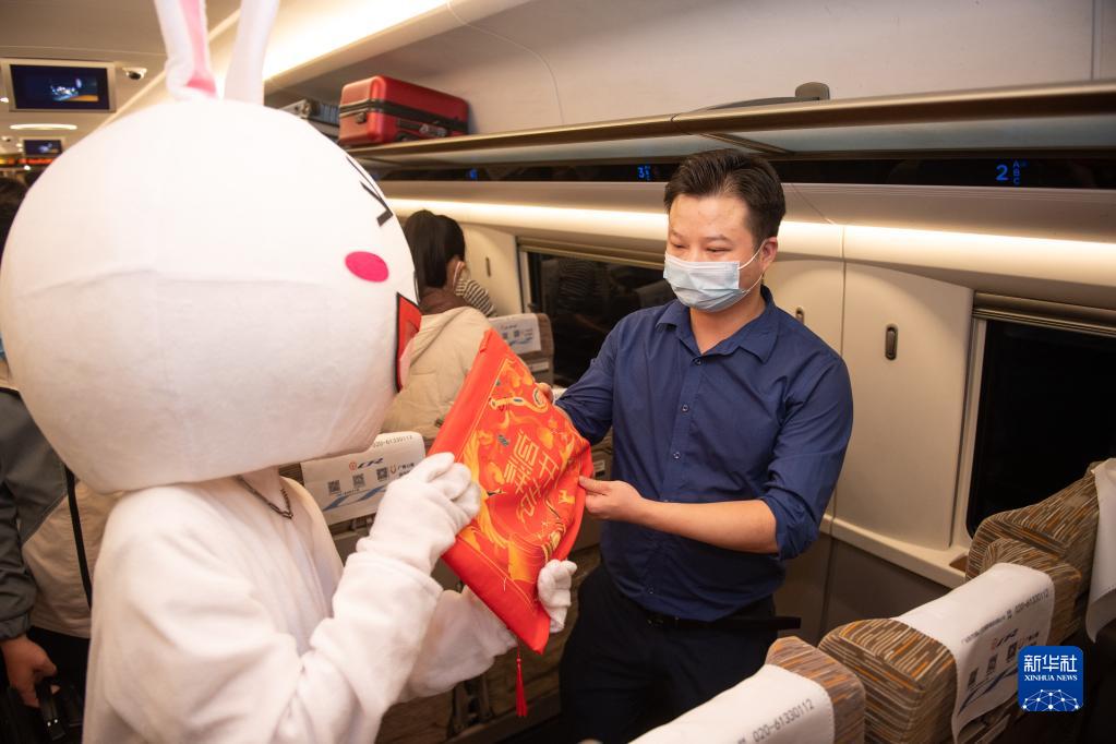 當日,G1008次愛心專列搭載著500多名長期在深圳工作的文明實踐志愿者從深圳北站駛往武漢。G1008次列車是深圳鐵路部門今年春運開出的第6趟愛心專列,暖心助力深圳地區的文明實踐志愿者和城市奮斗者及家人順利回家過年。新華社記者 毛思倩 攝