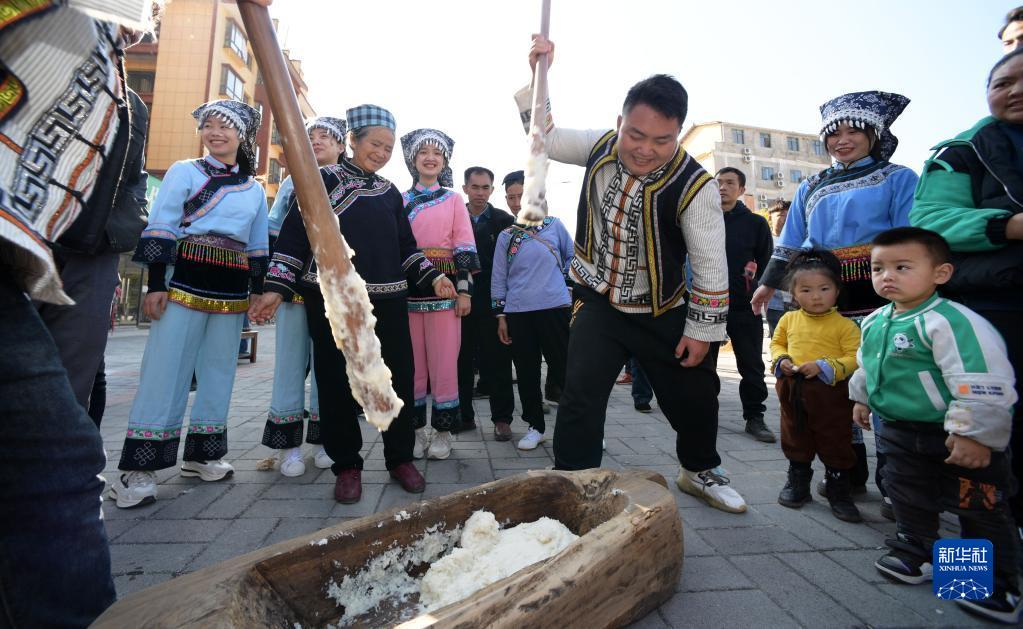 1月13日,當地群眾在羅甸縣木引鎮康夢家園參與打糍粑活動。