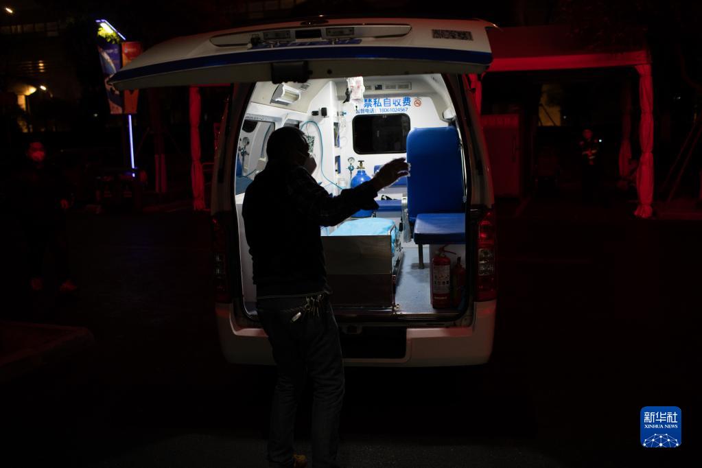 1月12日,在復旦大學附屬華山醫院虹橋院區急診大廳外,一輛轉運車工作人員做完消殺處置后準備離開。