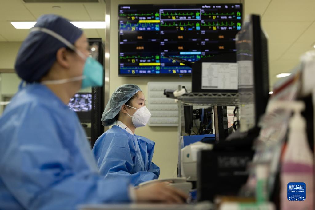 1月12日,在復旦大學附屬華山醫院虹橋院區收治肺炎患者的重癥監護室,醫護人員查看患者病情。